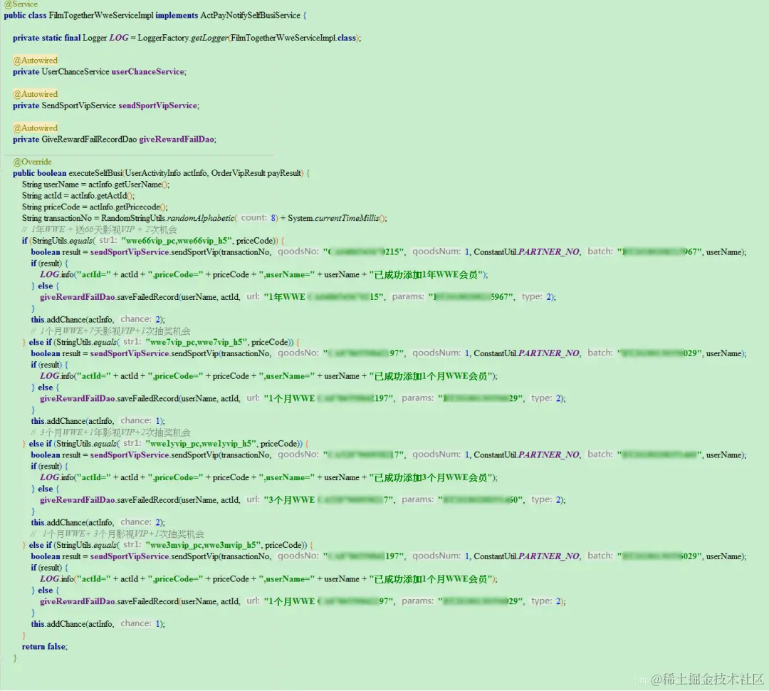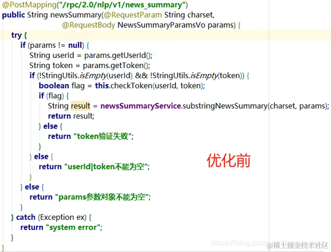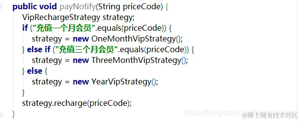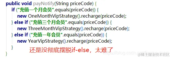 业务代码中,对于大量嵌套if-else的优化 liangsiyuan 2021-08-16 233 阅读1分钟 业务代码中大量嵌套IF-ELSE的优化 代码中使用了大量嵌套if-else的示例: 1.逻辑优化 优先判断条件,不满足的要提前中断 2.策略模式优化 接口: 各个条件的实现类: 条件1 条件2 条件3 优化后的代码: 或者,把recharge()方法放在最下面 2. 策略+工厂+单例优化 工厂类: 优化后的代码: 这代码就比之前看起来帅多了。当一个好后台,提高代码质量拒绝垃圾从我做起。 转载自:方志朋 微信公众号 因为懒得重新截图,所以直接用的公众号上的图片。侵删