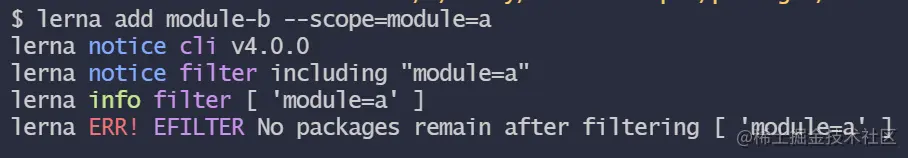原因的意思是,lerna命令的scope值错误导致过滤对应包名后,找不到对应的packages,scope值应该为对应包名即package.json中的name