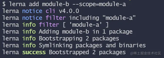 上面的 module-a 引入了 module-b 的 add 方法,我们怎么把依赖给关联起来呢?可以通过 lerna add 命令