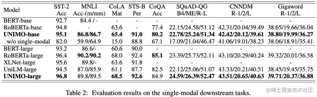 特别地,UNIMO 同时还能处理纯文本任务。此前的跨模态预训练模型,在处理纯文本任务的时候效果急剧下降,部分任务下降幅度甚至超过10-20个点。而 UNIMO 在各类文本理解和生成任务上,包括文本分类、文本推断、文本摘要、阅读理解和问题生成,均取得不错的效果,超过 RoBERTa、XLNet、UniLM 等经典文本模型。