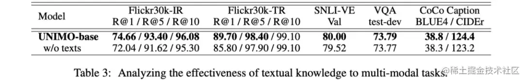 为了验证 UNIMO 进行单一模态和跨模态统一学习的必要性,论文进行了分离实验。实验结果表明,当不使用文本数据进行预训练的时候 UNIMO 在跨模态任务上效果有所下降。而当不使用图文对数据和图像数据的时候,UNIMO 在文本任务上同样会下降。这充分说明,UNIMO 统一学习的方式,能够让文本知识与视觉知识相互增强,有效提升任务效果。