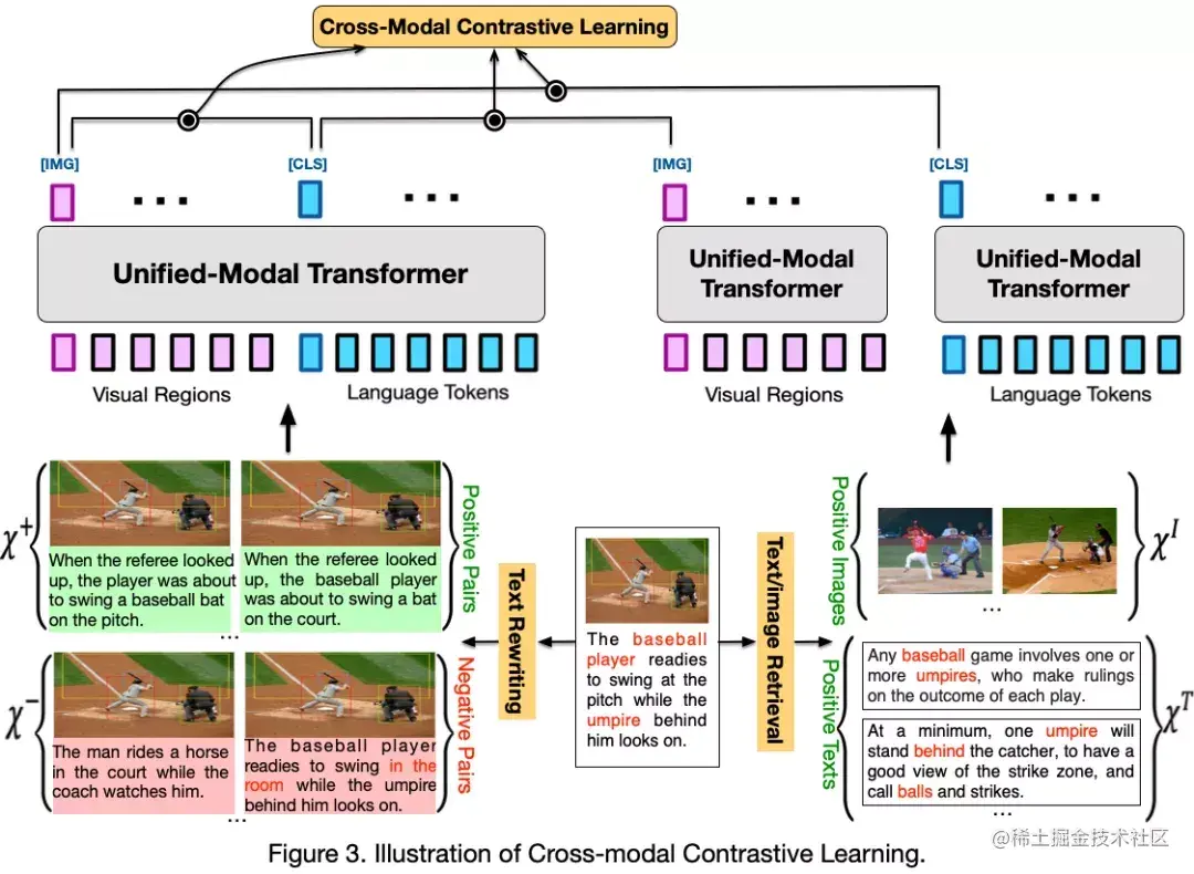 异构模态的统一预训练最大的挑战是如何跨越不同模态间的语义鸿沟从而实现语义表示的统一。如下图所示,UNIMO 提出了创新的跨模态对比学习方法,同时引入相关联的图文对数据、文本数据和图像数据进行联合对比学习。具体地,UNIMO 通过文本改写的方式,对图文对进行数据增广,获得大量的正例和强负例图文对数据。同时为了更好的利用文本和图像数据,UNIMO 通过文本与图像检索,获得相关的图像和文本作为正例。这样利用扩充后的多种类型的正例以及高质量强负例,UNIMO 在统一的语义空间上进行联想对比,从而能够学习到精确对齐的跨模态语义表示。