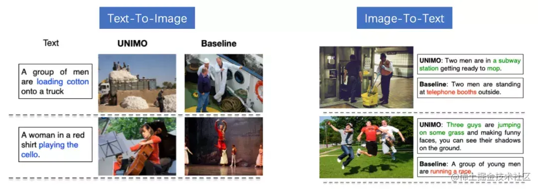 UNIMO 能够根据文字描述搜索相关图片,或者根据图片搜索相关文本描述。从结果上看,UNIMO 能够更准确的理解文字或图片的语义,检索出更匹配的图片或文字。