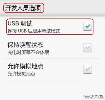 打开Android设备的"设定"功能 -> 打开"开发者选项"-> 选择USB调试,如图: