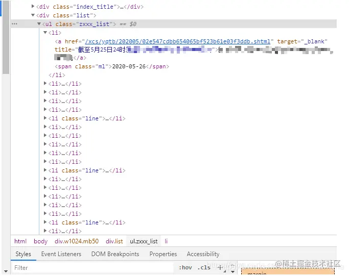如上图所示,我们通过 F12 召唤出来的开发者工具可以看到,所有的文章,都存放在一个 class 为 zxxx_list 的 ul 标签下,其中每一个 li 标签对应着一篇文章(除了中间有部分 class="line" 的 li 标签是作为分割线)。