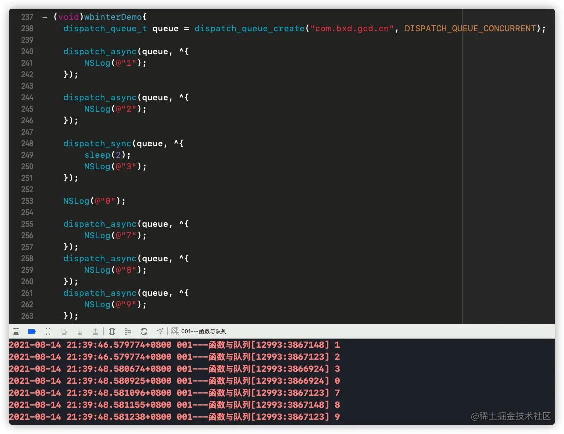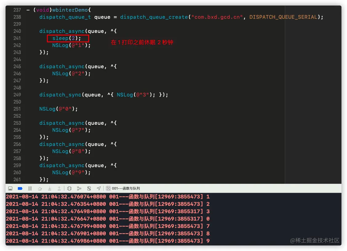 dispatch_sync(queue, ^{ NSLog(@"3"); })同步函数将会堵塞249行以下的代码,所以3一定比0先打印; - 3、穿行队列的特性