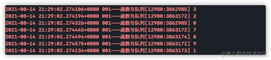 NSLog(@"1")和NSLog(@"2")都是异步函数,而且都处在并发队列中,所以1和2的打印顺序是无序的,也就是打印顺序有可能是1先打印,也有可能是2先打印,我们运行看一下打印结果: