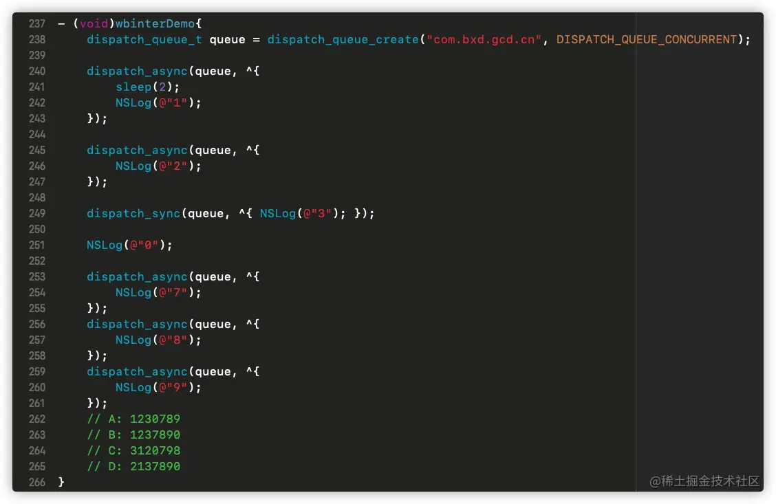 dispatch_sync(queue, ^{ NSLog(@"3"); })同步函数将会堵塞249行以下的代码,所以3一定比0先打印; 0在主队列中,所以0一定比7 8 9先打印;- 3、因为