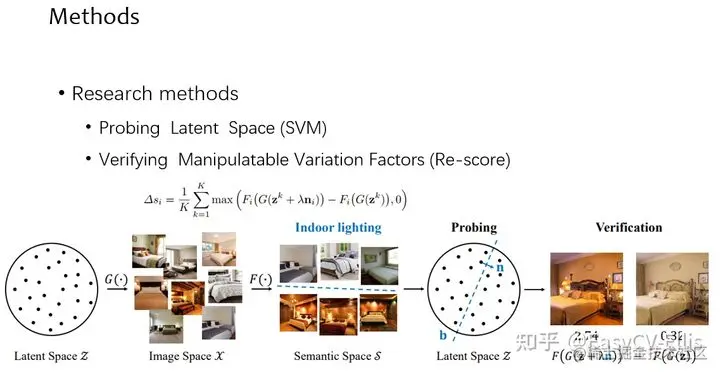 找潜在空间中的direction。具体的方法就是SVM,在 GAN 的 latent space 中,每个点对应着 image space 中的一张图片,同时也对应着潜在空间中的多种语义。Sample 一定量的图片后,用预训练好的分类器去获取他们对应的不同语义(对于某个属性,每个点代表的图片是属于哪一类值),接着对于某个属性,用一个 SVM 在 latent space 中学一个超平面,得到支持向量 n(可以分割开针对该属性属于不同类的样本),n作为我们的direction,和 InterfaceGAN 的方法几乎一样,不过 InterfaceGAN 处理的对象是 face,face 是容易定义的,而本文处理的是 scene,scene 的变化是很大的。