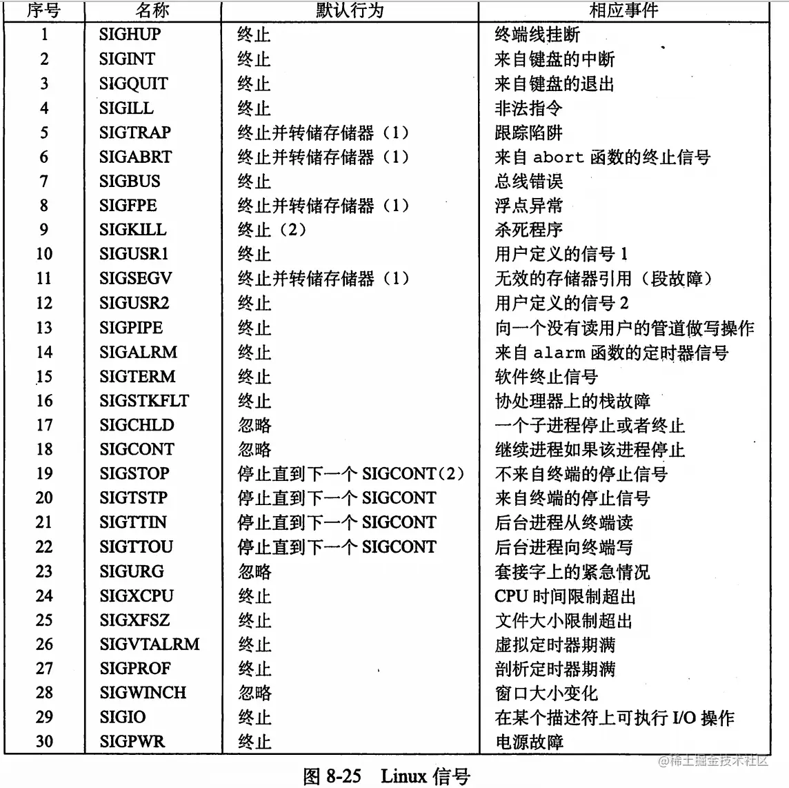- 如果该进程当前并未处于执行态,则该信号就由内核保存起来,直到该进程恢复执行再传递给它;如果一个信号被进程设置为阻塞,则该信号的传递被延迟,直到其阻塞被取消时才被传递给进程。