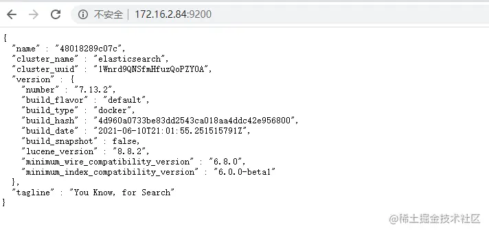 在浏览器打开,ip:9200看到es信息,就成功了,启动可能需要一点时间,要等一会。