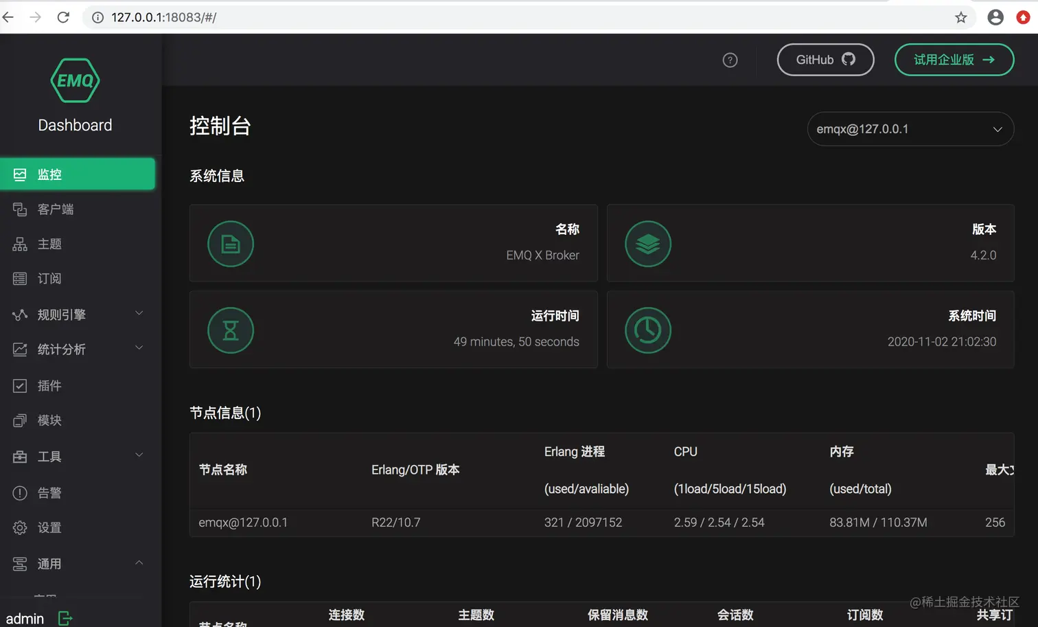 启动服务器后,浏览器打开http://127.0.0.1:18083,使用默认管理账号admin/public即可登录查看,在设置里还能改成中文界面,很方便。