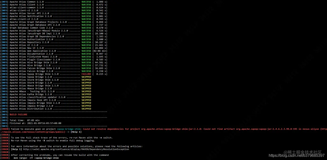 atlas编译用的sqoop.jar比较扯淡,1.4.6.2.3.99.0-195这个版本不太好找。我是用的是阿里的仓库http://maven.aliyun.com/nexus/content/groups/public下载,阿里仓库不存在该jar包。