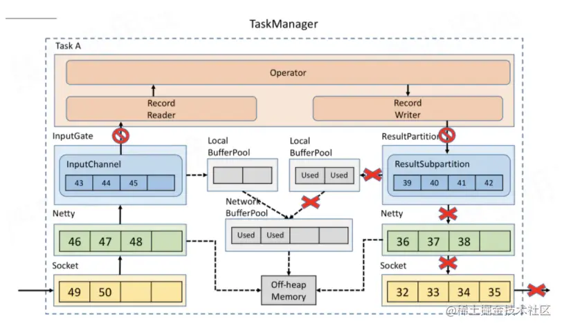 假如 Task A 的下游所有 Buffer 都占满了,那么 Task A 的 Record Writer 会被 block,Task A 的 Record Reader、Operator、Record Writer 都属于同一个线程,所以 Task A 的 Record Reader 也会被 block。