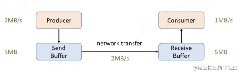 那么问题来了,下图中,上游 Producer 向下游 Consumer 发送数据,在发送端和接受端都有相应的 Send Buffer 和 Receive Buffer,但是上游 Producer 生成数据的速率比下游 Consumer 消费数据的速率快。Producer 生产数据 2MB/s, Consumer 消费数据 1MB/s,Receive Buffer 只有 5MB,所以过了5秒后,接收端的 Receive Buffer 满了。(可以把下图中的 Producer 当做上面案例中的 subtask A0,把下图中的 Consumer 当做上面案例中的 subtask B0)