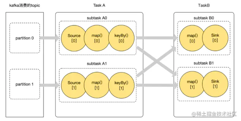 图中,任务被切分成 4 个可独立执行的 subtask( A0、A1、B0、B1),在数据处理过程中,就会存在 shuffle(数据传输)的过程。例如,subtask A0 处理完的数据经过 keyBy 后发送到 subtask B0、B1 所在节点去处理。
