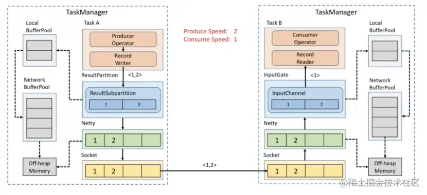 场景:Producer 端生产数据速率为2,Consumer 端消费数据速率为1。数据从 Task A 的 ResultSubPartition 按照上面的流程最后传输到 Task B 的 InputChannel 供 Task B 读取并计算。持续一段时间后,由于 Task B 消费比较慢,导致 InputChannel 被占满了,所以 InputChannel 向 LocalBufferPool 申请新的 Buffer 空间,LocalBufferPool 分配给 InputChannel 一些 Buffer。