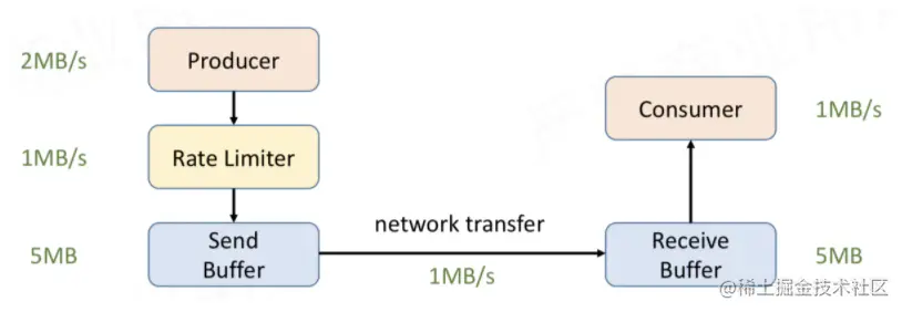 该问题的解决方案不应该是下游 Receive Buffer 一直累积数据,而是上游 Producer 发现下游 Consumer 处理比较慢之后,应该在 Producer 端做出限流的策略,防止在下游 Consumer 端无限制的数据堆积。