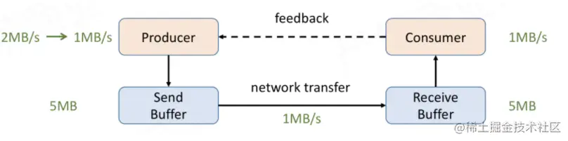 就算通过某种方式预估出下游 Consumer 端能承受的最大速率,下游应用程序也可能会因为网络抖动、 CPU 共享竞争、内存紧张、IO阻塞等原因造成下游应用程序的吞吐量降低,然后又会出现上面所说的下游接收区的 Receive Buffer 有限,上游一直有源源不断的数据发送到下游的问题,还是会造成下游要么丢数据,要么为了不丢数据 buffer 不断扩充导致下游 OOM的问题
