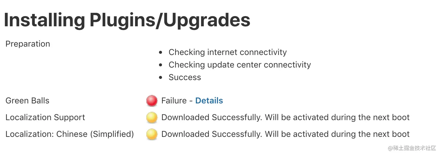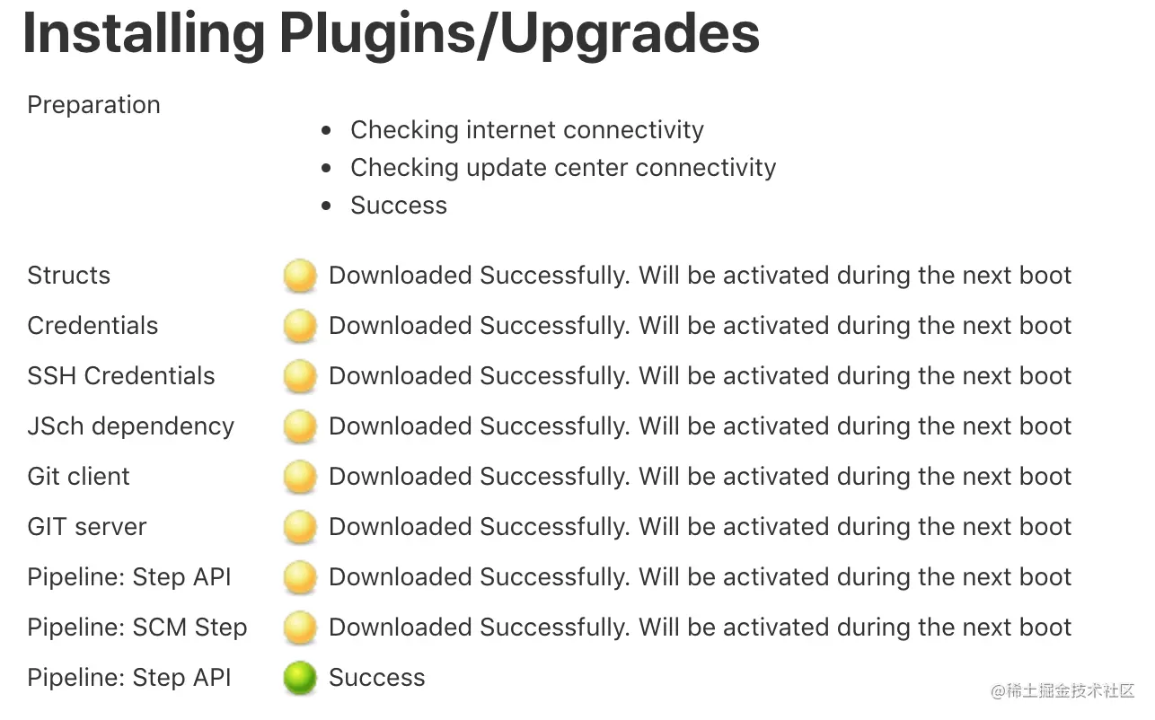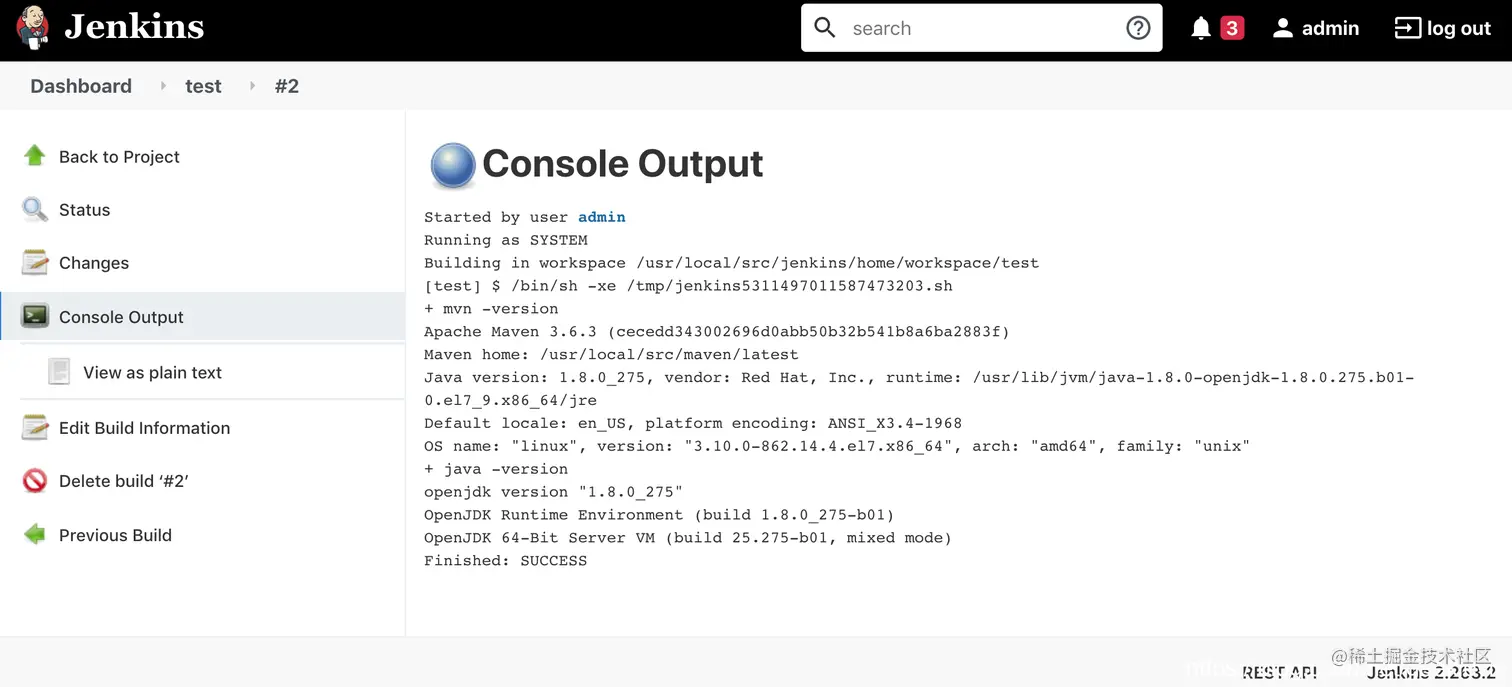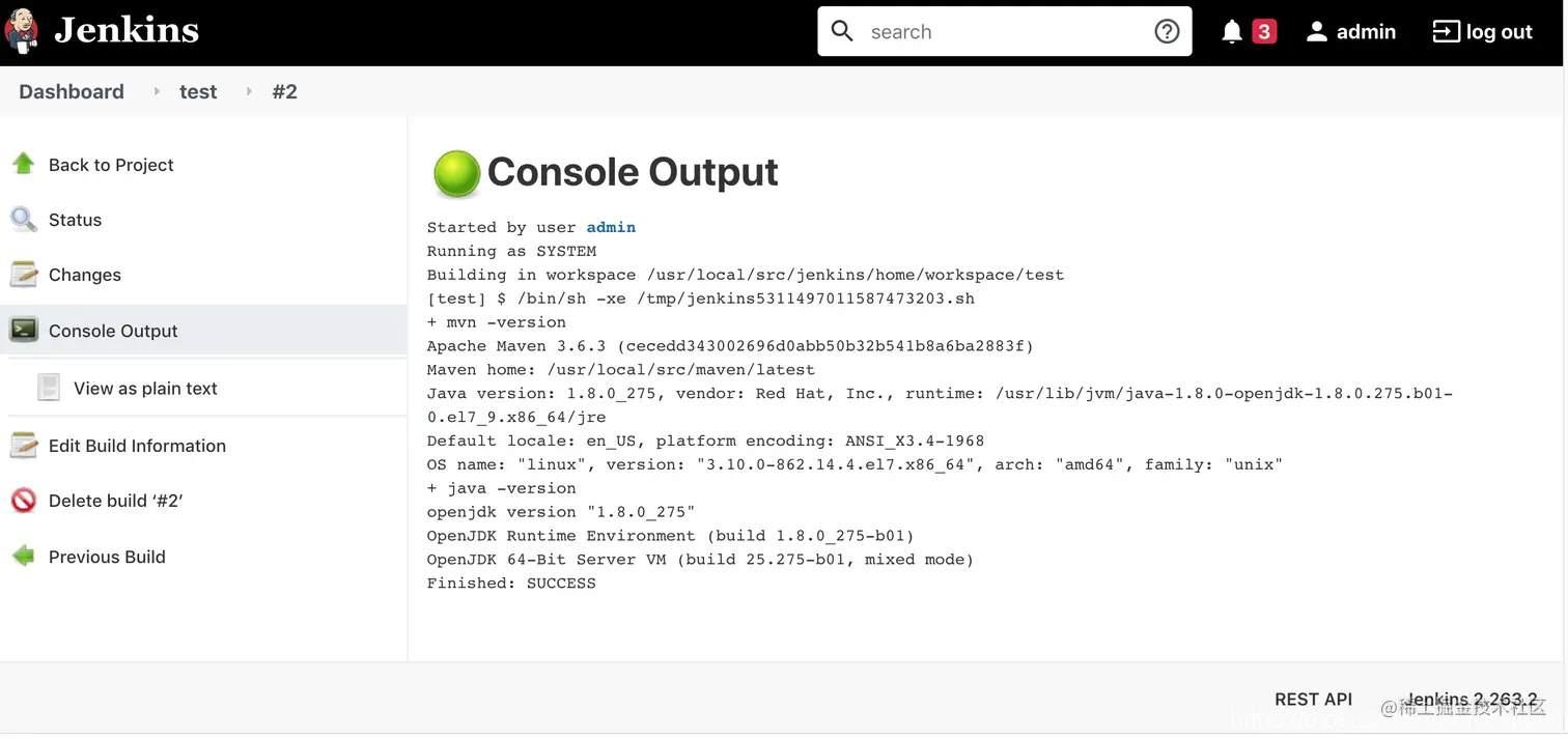 安装成功重启后,打开原来的test job发现Console Output旁边的圆形图标变成绿色的了。