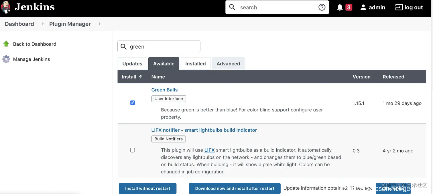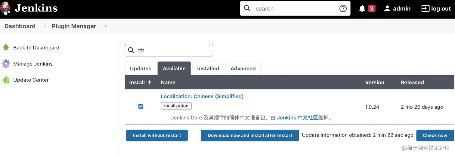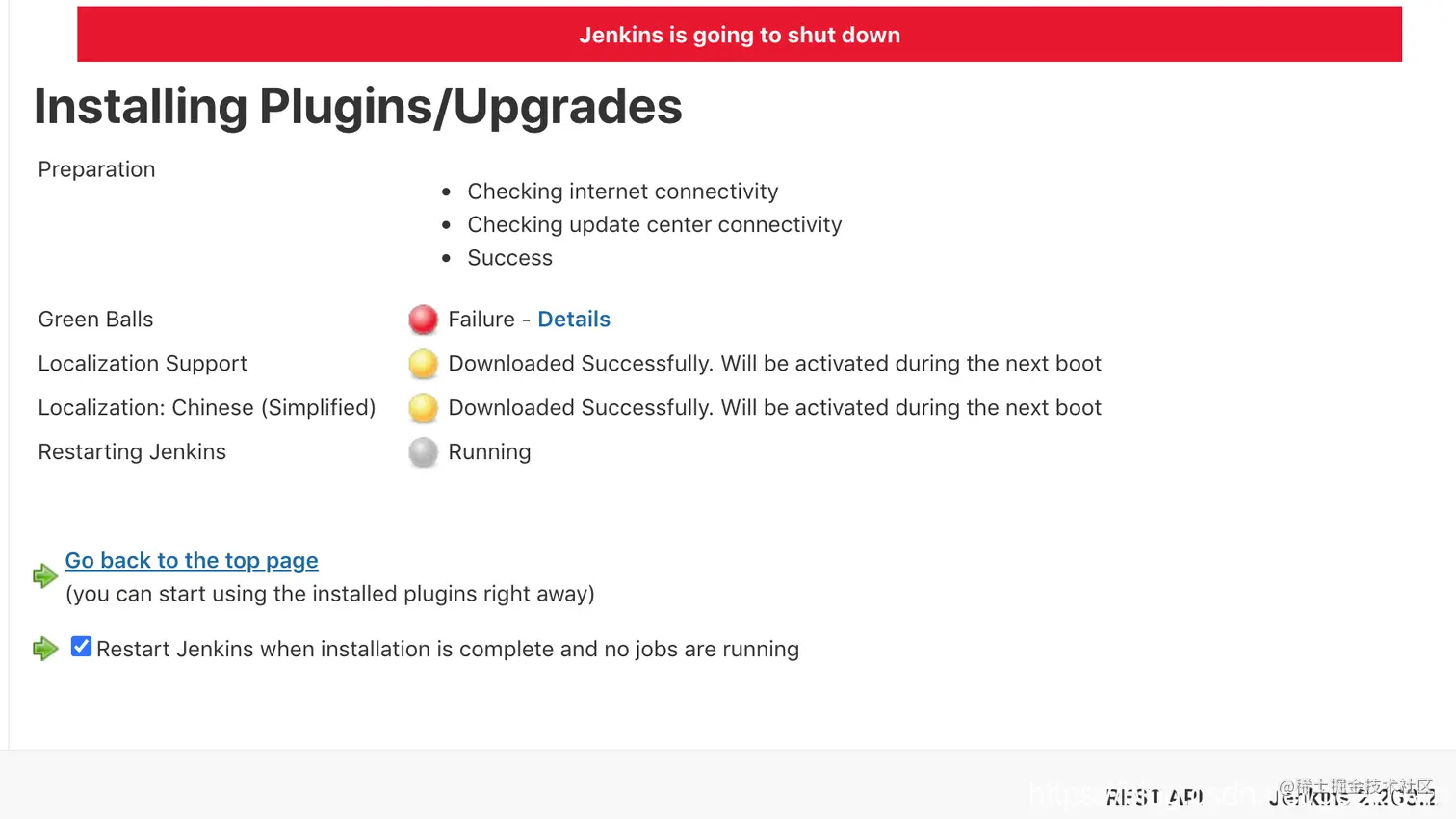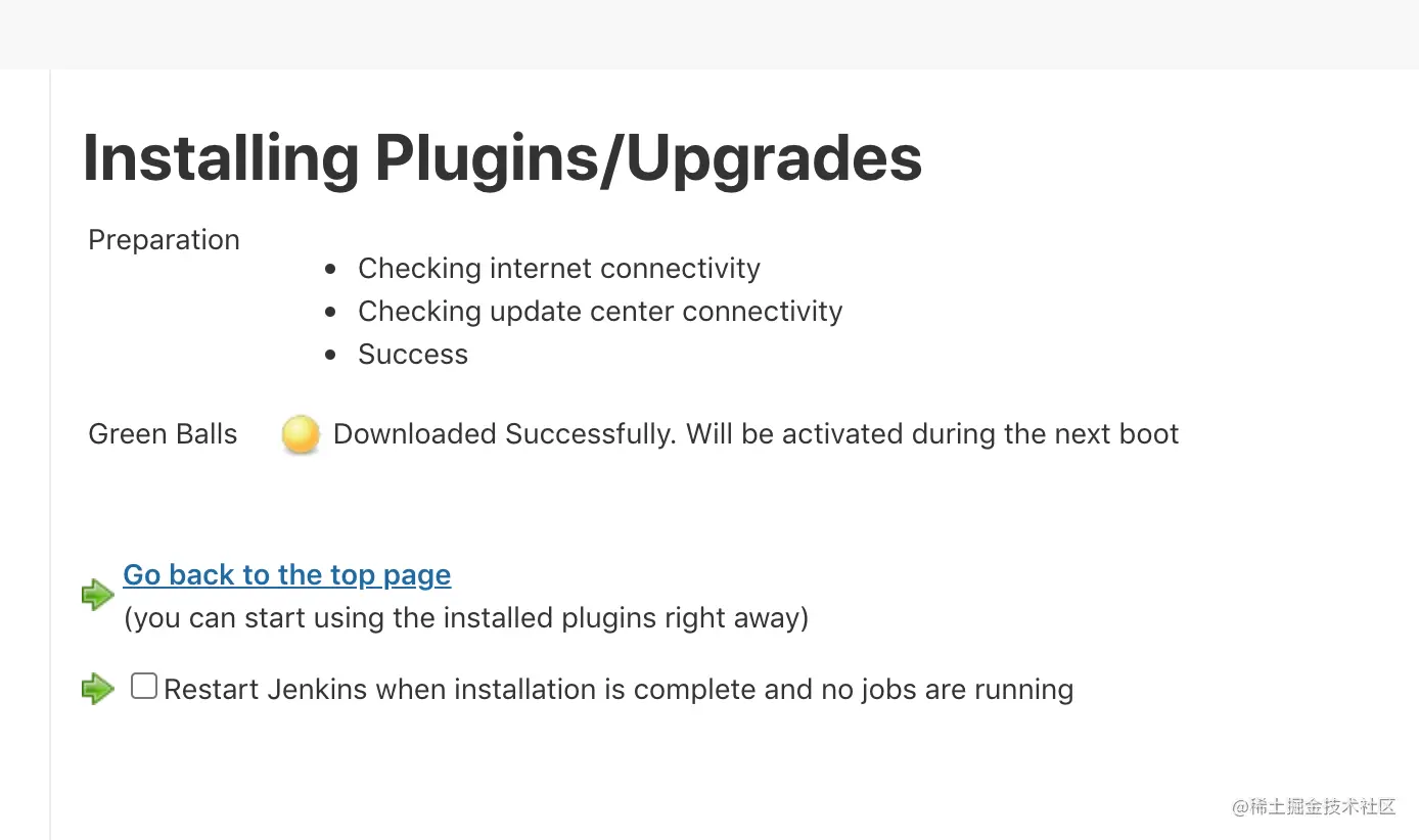 勾选 Restart Jenkins 这一栏,可以重启并加载下载好的插件。