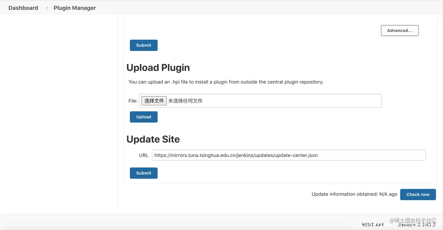 新装的Jenkins会有很多警告信息,也可以跑去Update Center,选择升级,消除警告。