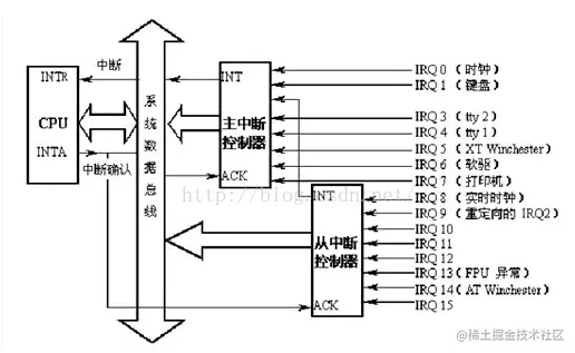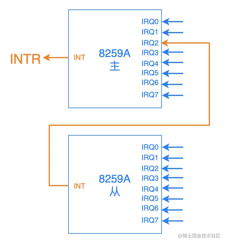 每一片 8259a 可以提供 8 个中断输入引脚,两片芯片级联在一起,就可以提供 15 个中断信号:
