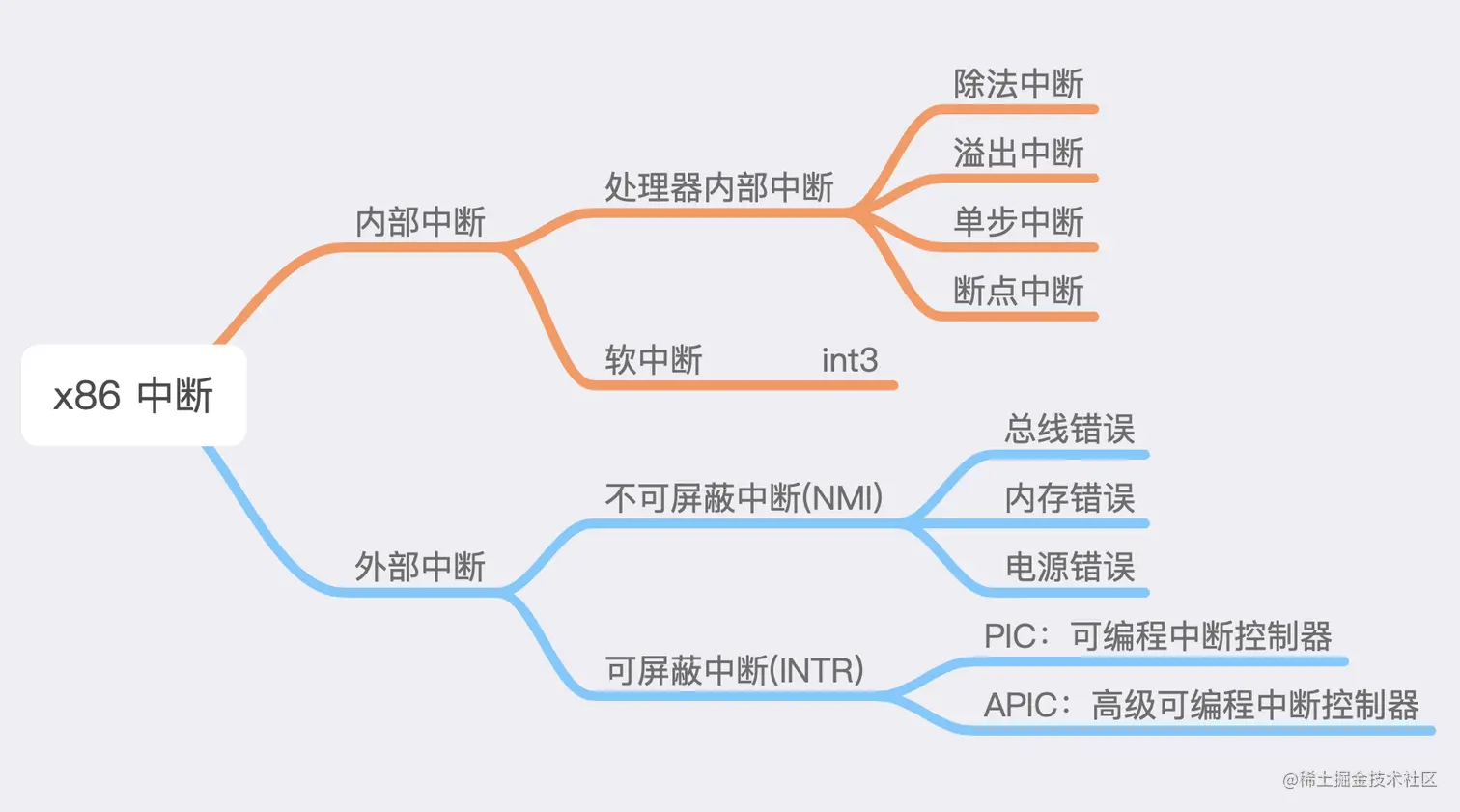 x86 CPU 上有 2 个中断引脚:INT 和 INTR,分别对应:不可屏蔽中断和可屏蔽中断。