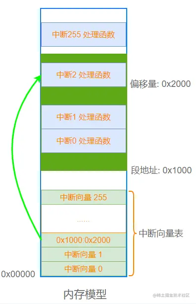 意思是:2 号中断的处理函数,在段地址为 0x1000,偏移量为 0x2000 的位置处。