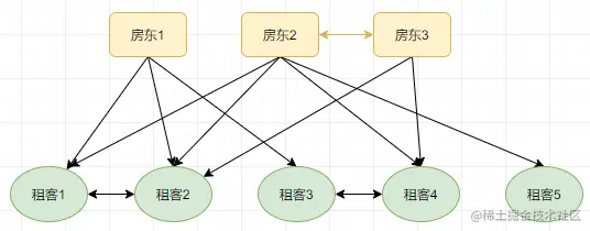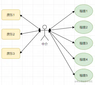 举个例子,在房产中介还没出来前,房东与租客间的关系是这样的(多对多的网状关系):