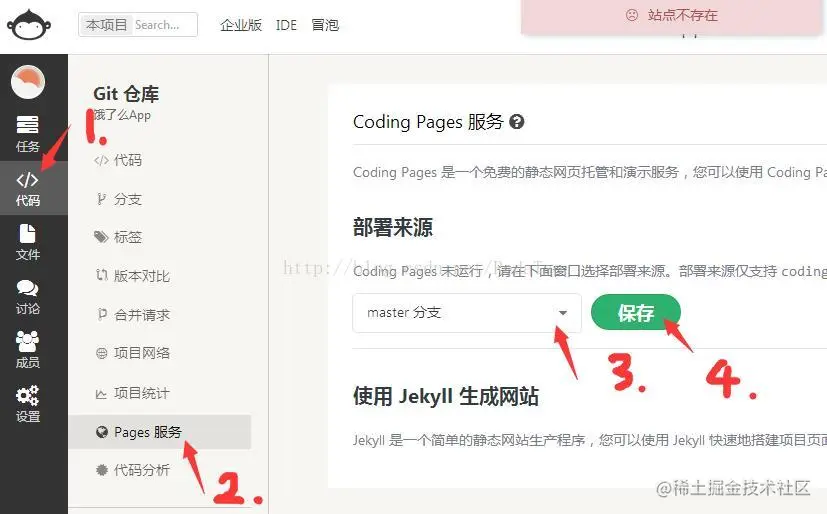 在coding上ele-app项目中选择:代码--pages服务--部署来源选择master分支--保存,如下图