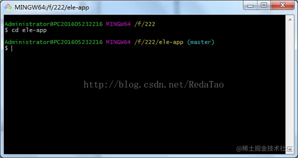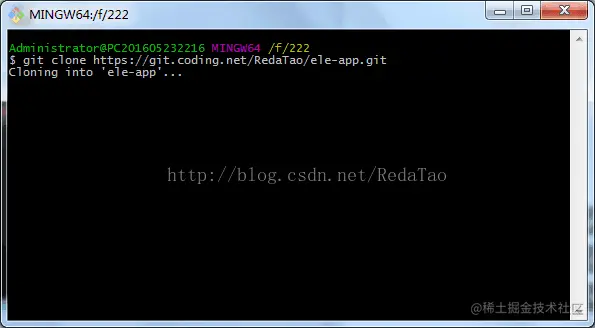 输入指令:git clone git.coding.net/RedaTao/ele… //这个位置就是刚刚复制的位置;