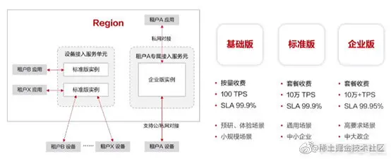 单元化在华为云IoT产品上有什么体现呢?我们设备接入服务有多实例的一个形态,它可以让联接按需定制。华为云IoT设备接入服务有三个版本,基础版、标准版和企业版。基础版和标准版其实就是多个实例共享多个单元。企业版是一个实例独占一个单元,它是独立的VPC,有独立的网络,支持公/私网的对接。