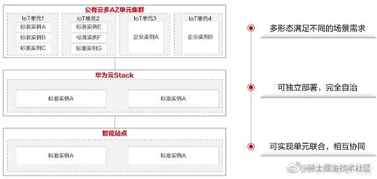 既然有横向单元化,那也有纵向的单元化。我们在公有云上有物联网平台,混合云上有华为云Stack,它是部署在客户的现场,一般是几个机柜、几十台物理机这样的规模。想要轻量一点就可以使用华为云的智能站点,只需要一个机柜,三台物理机起,可以部署在客户的机房,甚至部署在办公区域,这是构建了一个纵向的单元。像工厂这种场景,数据量比较大,会希望就近处理数据,因为这样比较快,而且更可靠,减少了公网的依赖,还能有效地减少数据上云,可以在本地做处理。像这三种形态有不同的应用场景,它们可以独立的部署,完全自制,就是说我们的业务场景可以选一个单元去做这样的事情,选一个形态,也可以实现单元联合,可以协同。