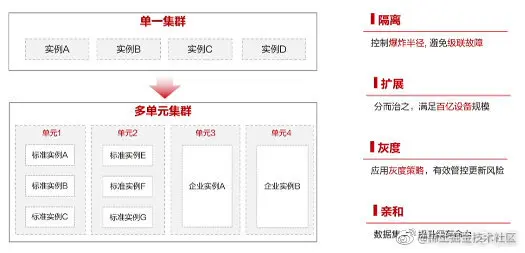 我们传统的模式是单一集群,里面有很多的实例。当把单一集群拆分成很多的单元,一些实例会去共享一个单元,也有一些实例会独占一个单元,就是根据产品设计去决定的。那这样就形成一个多单元的集群,它又有什么优点呢?