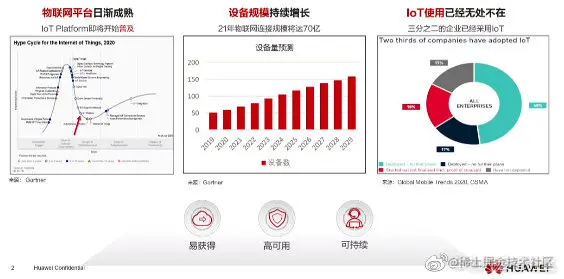 首先摘取了三组分析师的报告,我们可以看出,物联网的平台已经变得越来越成熟,2021年整个物联网连接规模将达到70亿,三分之二的企业已经在采用IoT。