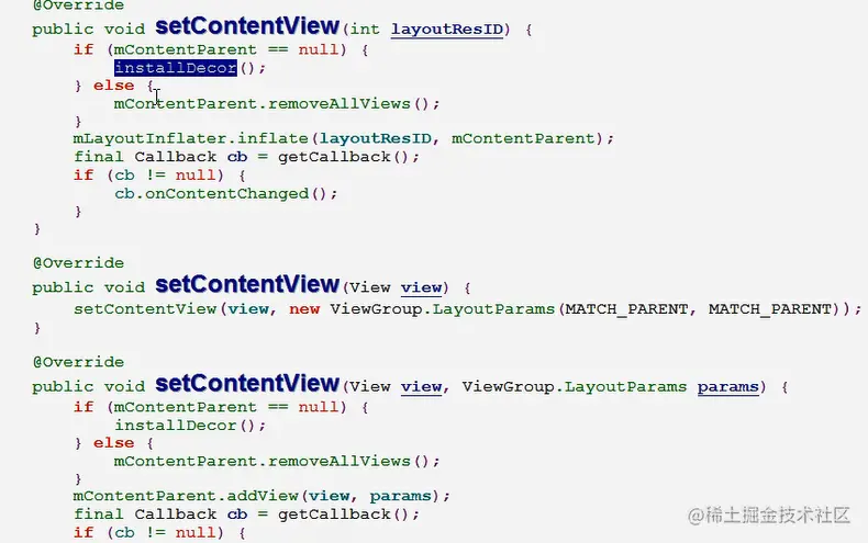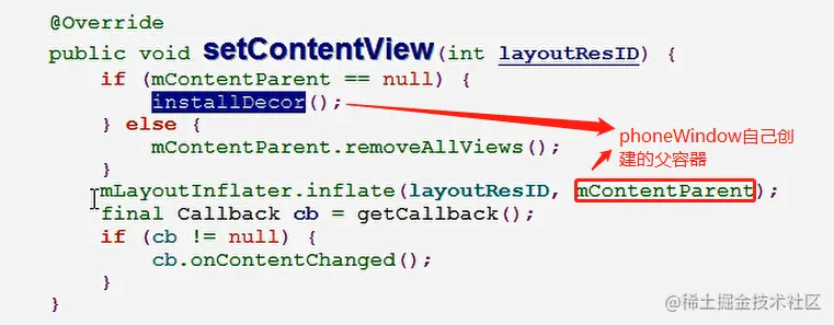 咱们平常开发时在xml中写的布局并不是根结点, 而是contentParent的子view