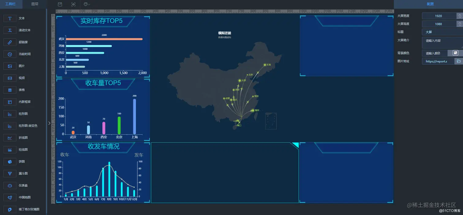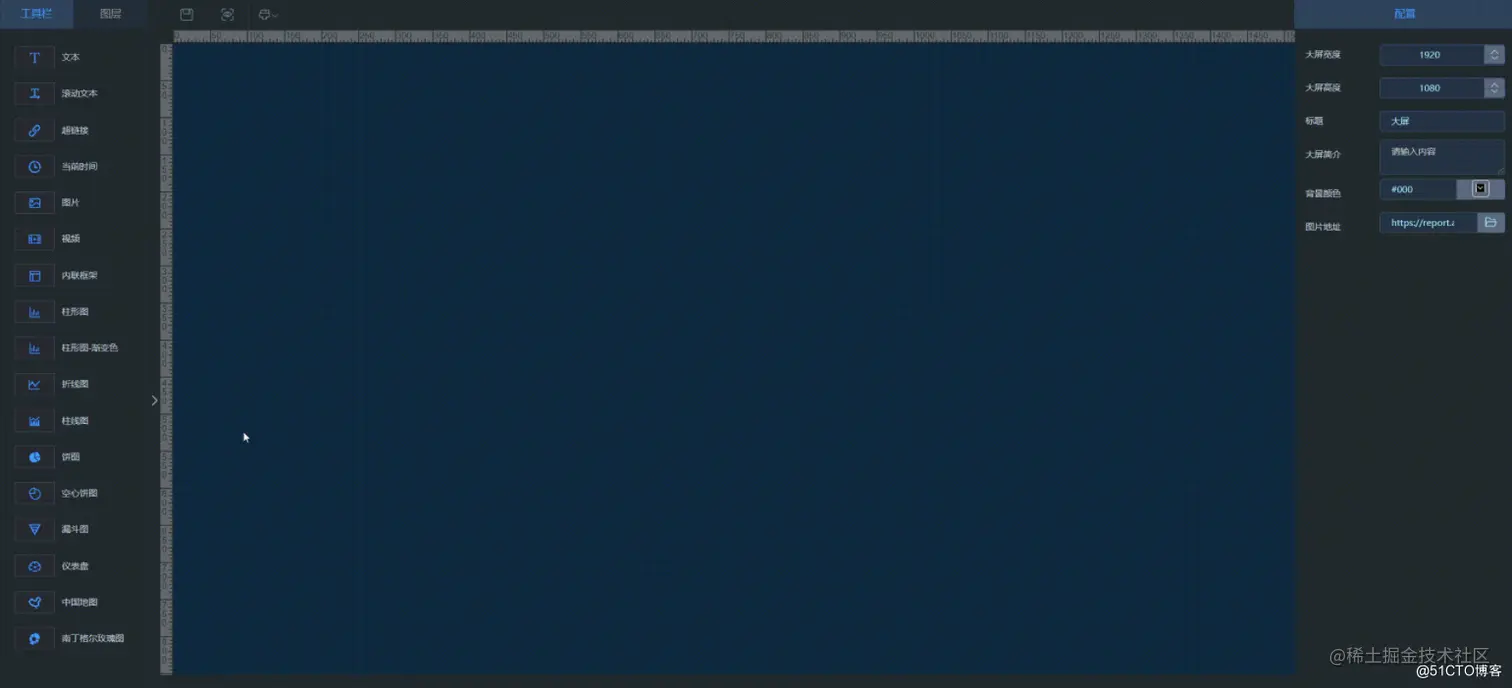 该大屏设计是一个可视化拖拽编辑的全开源项目,直观,酷炫,具有科技感的图表工具。内置的基础功能包括数据源,数据集,报表管理。