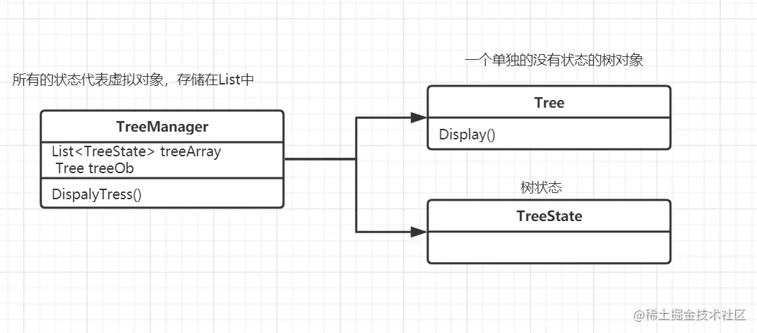 在一个设计房子的平台中,周围要加上一些树,树有一个坐标XY坐标位置,而且可以根据树的年龄动态将自己绘制出来。如果我们创建许多树之后,会有许多树的实例对象。使用一个树实例和一个客户对象来维护“所有”树的状态,这就是蝇量模式。
