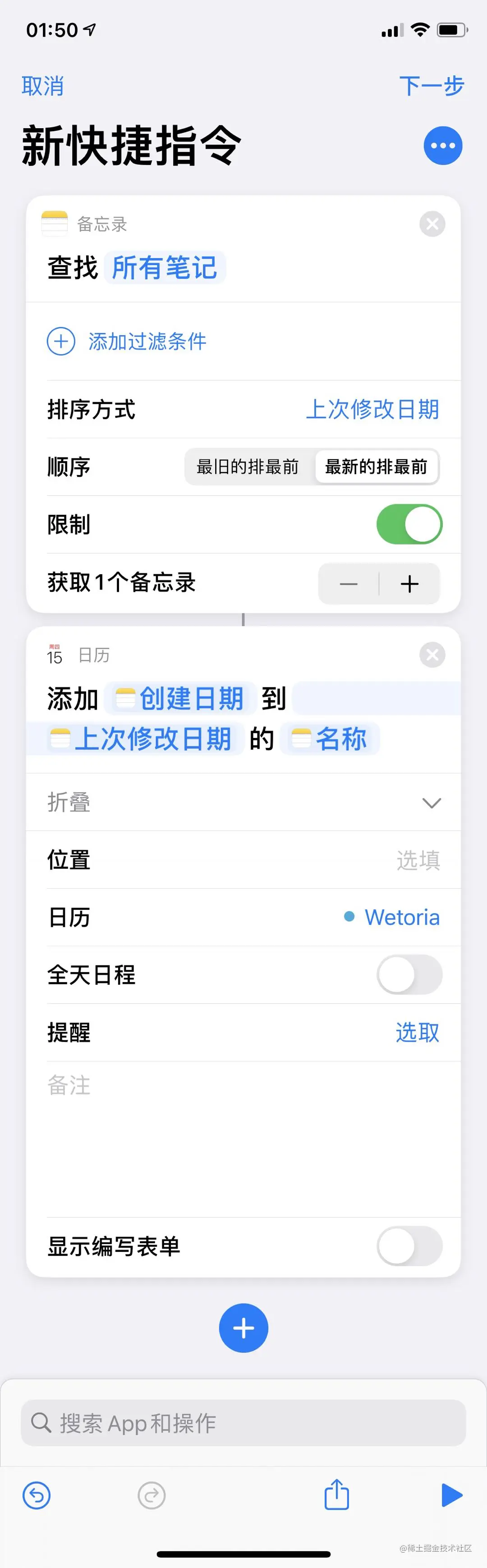使用捷径 app 添加下面这样的操作,就可以获取最新一条笔记,并创建一个日程。