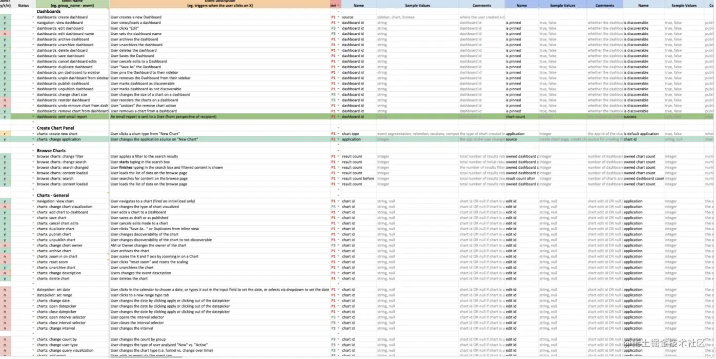 如果你未使用产品分析平台来组织事件分类,则可能会使用下面的电子表格来跟踪事件,事件属性和用户属性的所有名称。