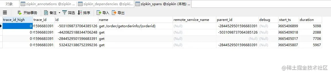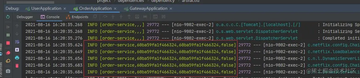 请求结果成功后,在订单微服务的控制台可以看到调用链日志: