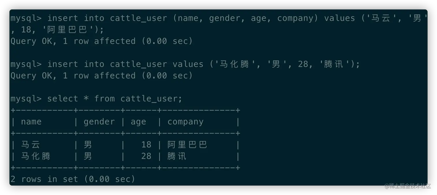 insert into cattle_user (name, gender, age, company) values ('马云', '男', 18, '阿里巴巴');