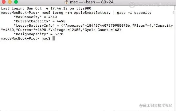 mac电池损耗百分比怎么查看 路过mac 2021-08-17 3,243 阅读1分钟 如何查看mac的电池损耗呢? 首先Mac系统搜索终端, 在终端粘贴下面命令: ioreg -rn AppleSmartBattery | grep -i capacity 回车。 你会见到下面文字: 其中,Maxcapacity是你的电池目前的最大可用容量。Designcapacity是电池设计容量,也就是电池全新时候的容量。比如我的Mac电池的最大可用容量是4640,电池设计容量是5770,那么我的电池损耗是4640➗5770=0.8041,也就是80%左右。最后这个过程需要你手动计算。