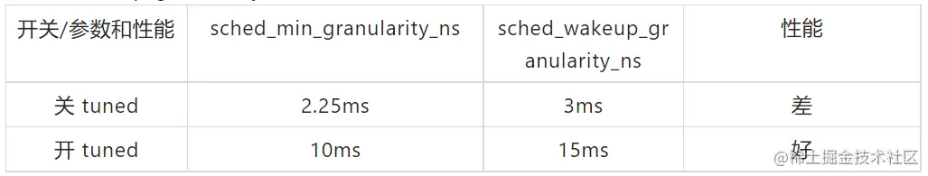 在hackbench-socket 测试中,tuned修改了 CFS 的 sched_min_granularity_ns 和 sched_wakeup_granularity_ns 两个参数,导致了性能的显著区别。具体如下: