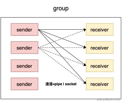 - 同一个 group 中的sender 和 receiver 有两种方式进行通信:pipe 和 local socket(一次测试中只能都是 pipe 或者 socket),不同 group 之间的线程没有交互关系。