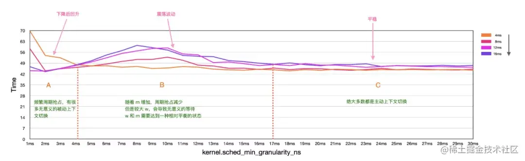 通过修改 kernel.sched_min_granularity_ns,可以影响 CFS 调度周期(sched period)的时间长短。例如:设置kernel.sched_min_granularity_ns = m,当系统中存在大量可运行进程时,m 越大,CFS 调度周期就越长。