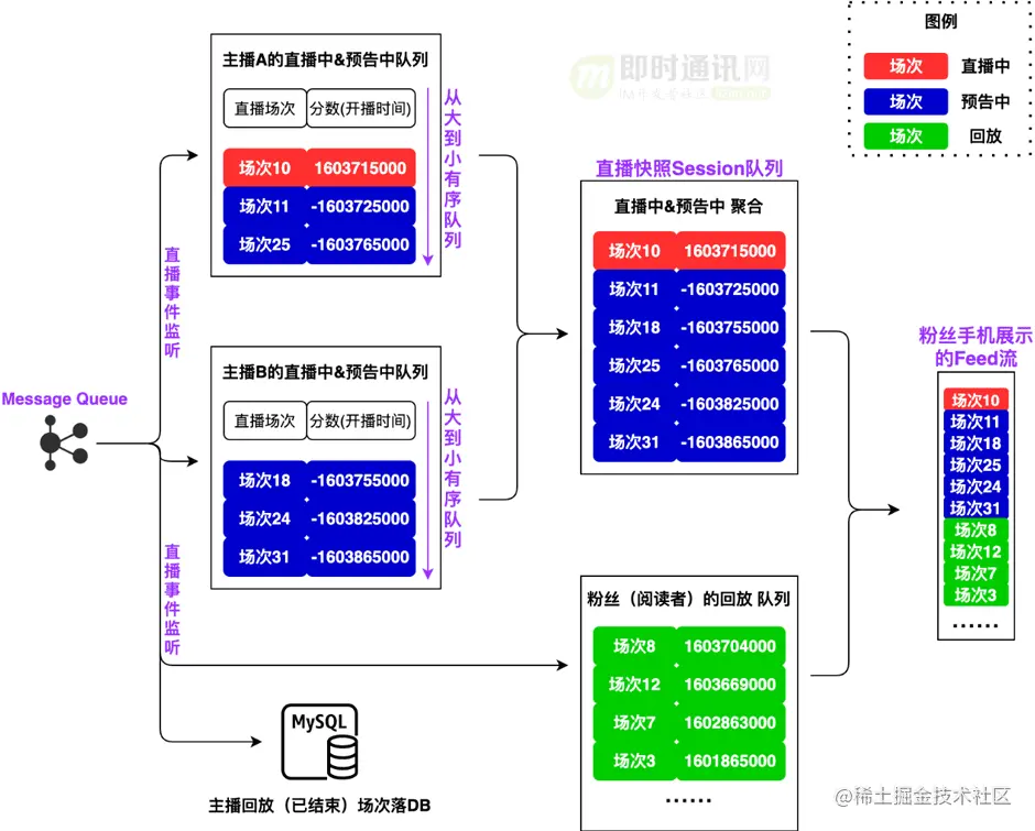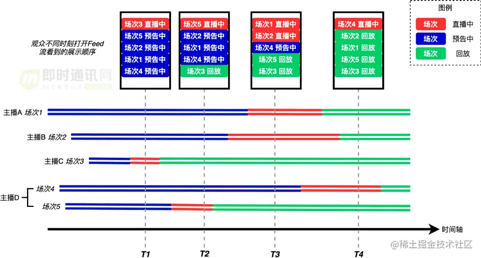 上图中: 展示了4个主播的5个直播场次,作为观众,当我在T1时刻打开页面,看到的顺序是场次3在最上方,其余场次均在预告状态,按照预计开播时间从早到晚展示。当我在T2时刻打开页面,场次5在最上方,其余有三场在预告状态排在中间,场次3已经结束了所以排在最后。以此类推,直到所有直播都结束,所有场次最终的状态都会变为回放。