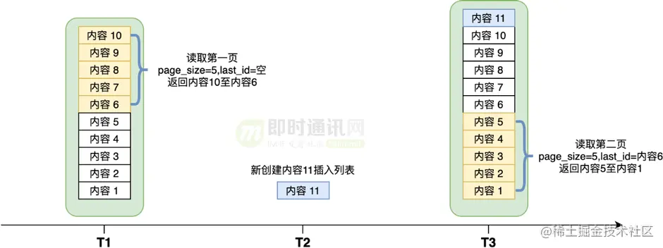 - 1)上图中T1时刻返回5条数据,last_id为内容6;